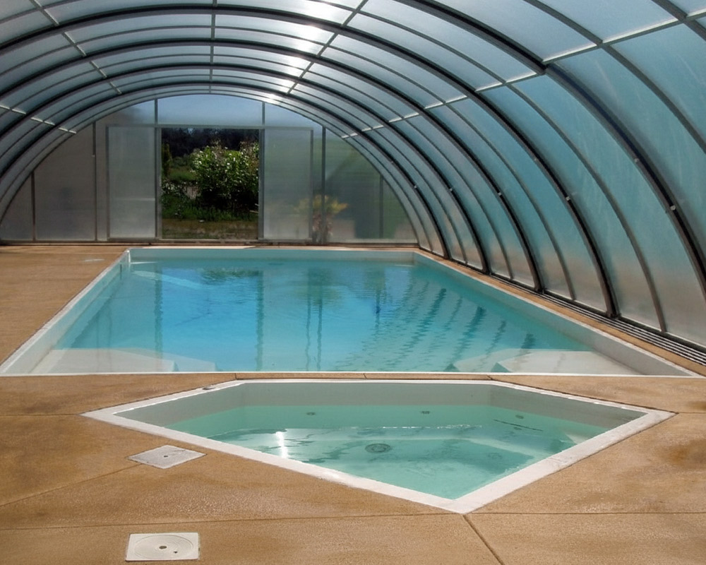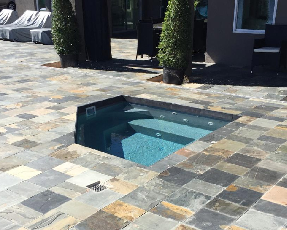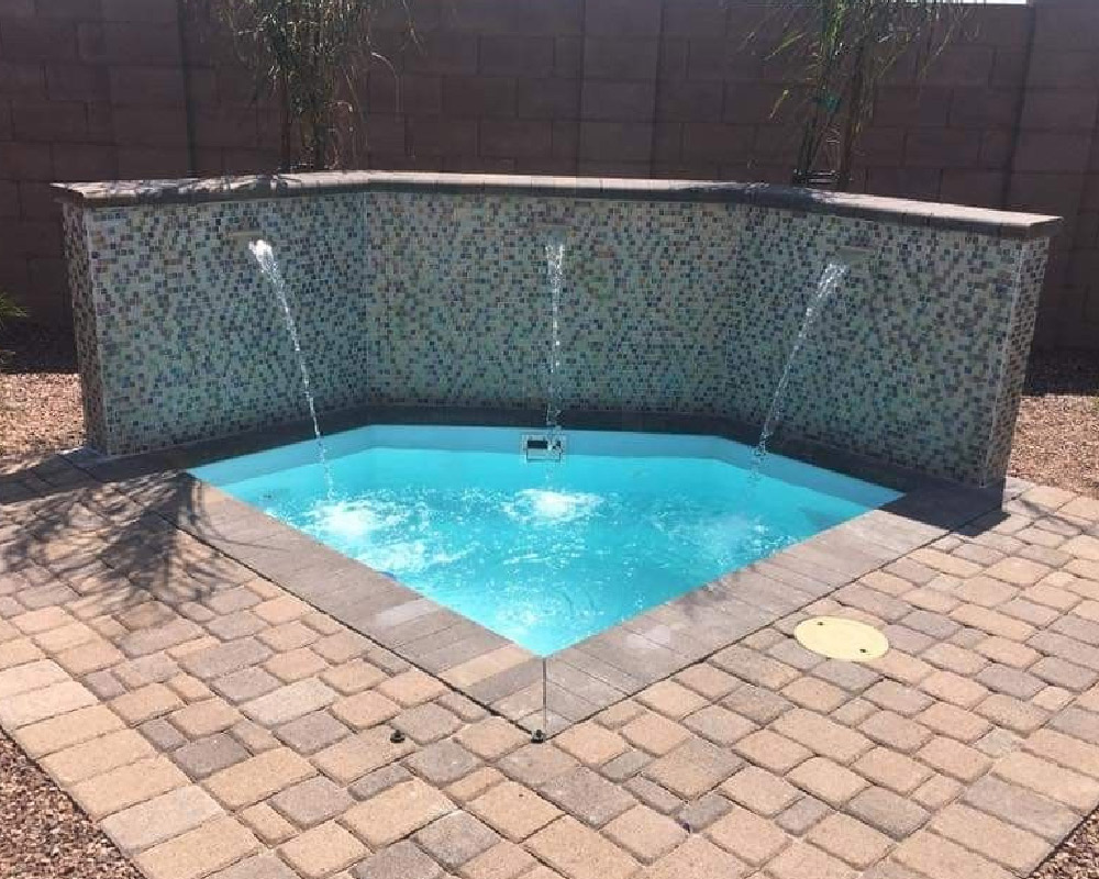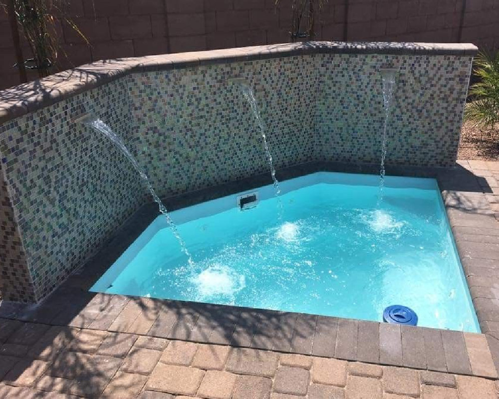 This stunning San Juan fiberglass spa is shaped like a diamond, with sharp, cutting corners that add a touch of elegance to any outdoor living space. This unique spa is truly special for our clients who want to create a one-of-a-kind outdoor design. With a maximum depth of only 2′ 11″, it’s perfect for swimmers of all ages and skill levels.
